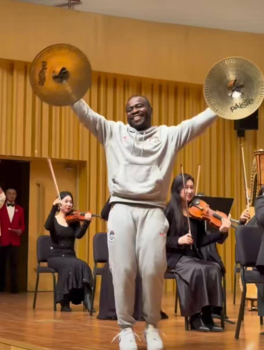 据网友发布视频,阿奇姆彭在不雅众的惊呼声中手持乐器镲登台,跟着乐曲节律击打舞动,身体也同步舞动,饰演得相等尽兴。一曲竣事,他仍难掩慷慨,还转了几个圈。网友驳倒谈:“他玩得太喜跃了”“下一个赛季不错从河南足球俱乐部转会到交响乐团”。